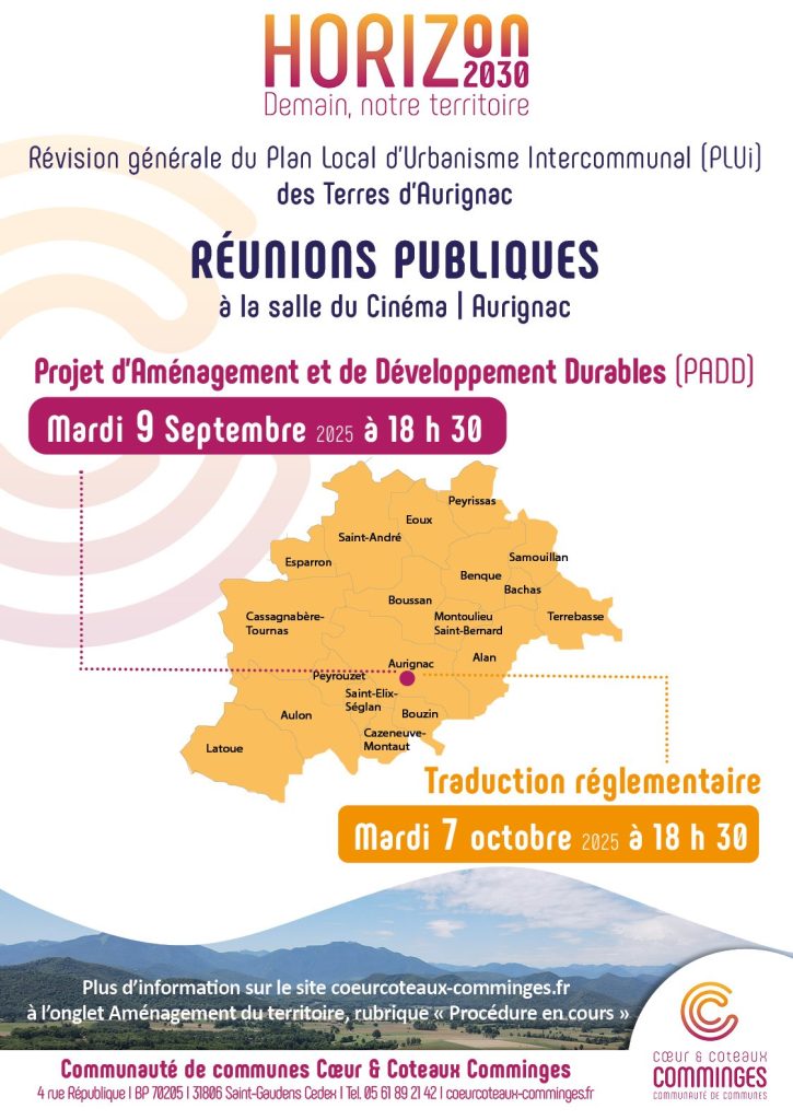 REVISON DU PLUi SUR LES TERRES D’AURIGNAC 2 REUNIONS PUBLIQUES à AURIGNAC pour vous informer
